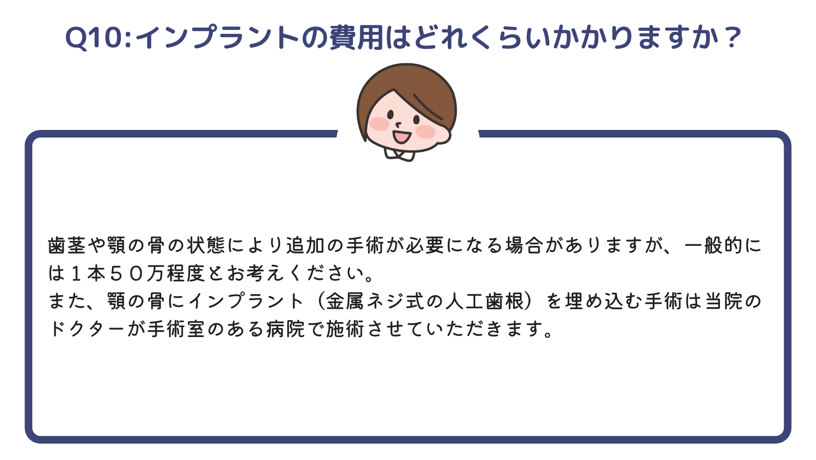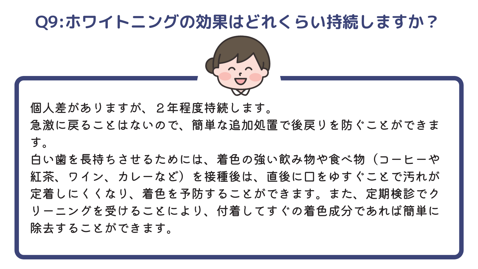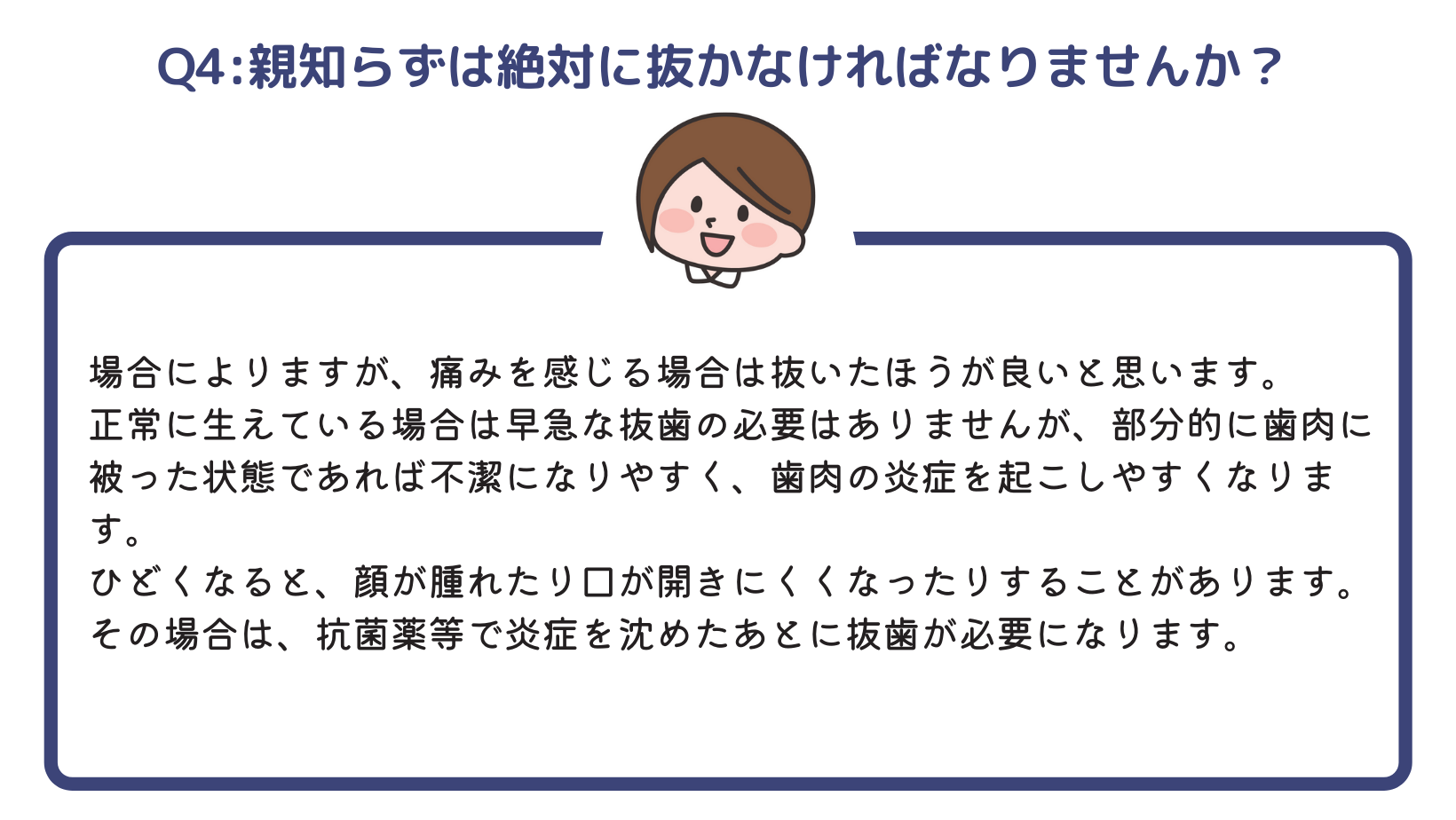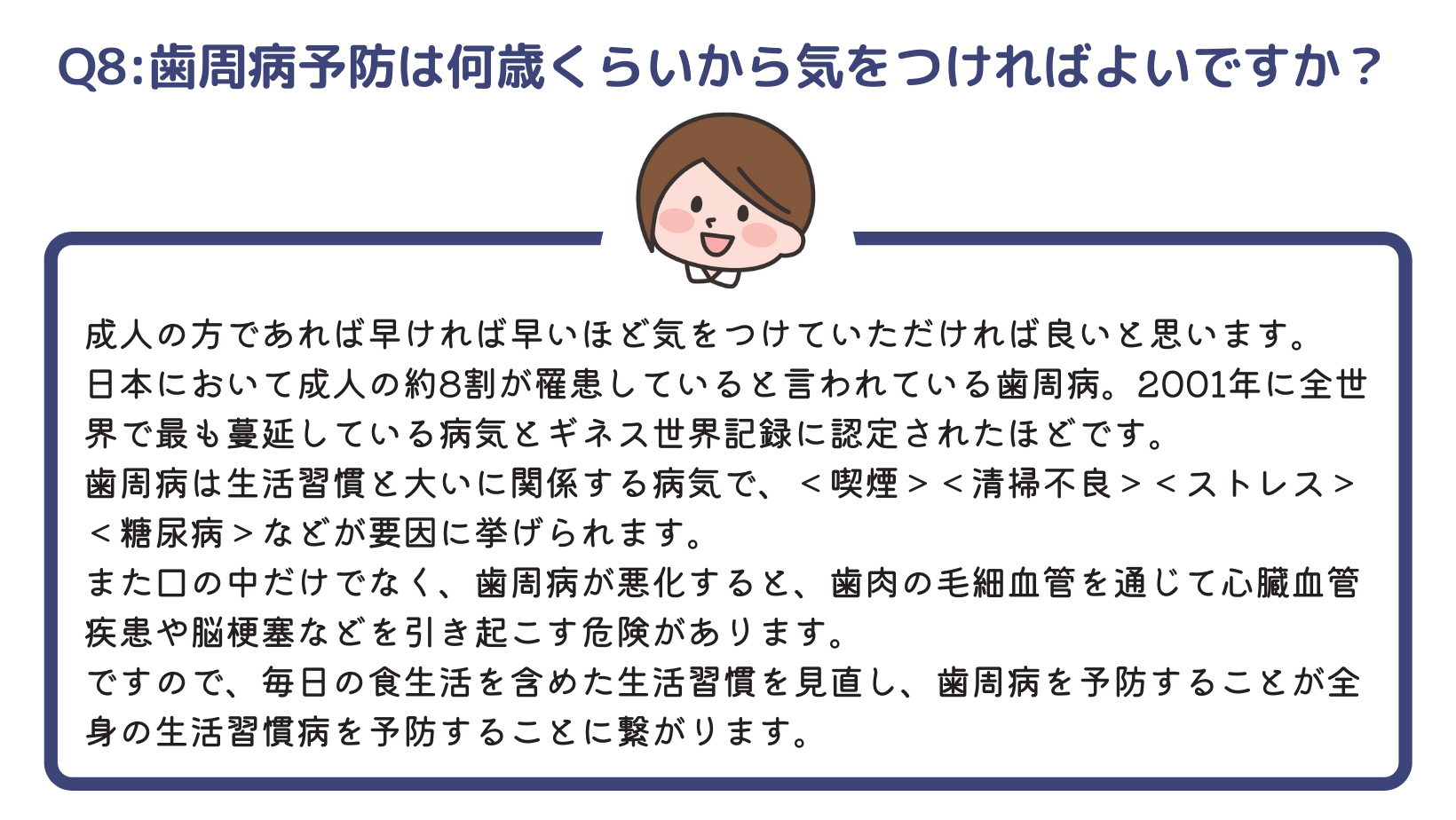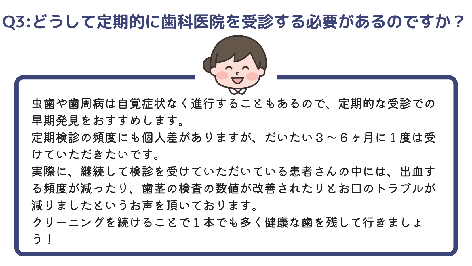※回答内容は一例であり、全ての患者さんに当てはまる訳ではないので、ご自身の症状に関して詳しくは歯科医院へご相談ください。