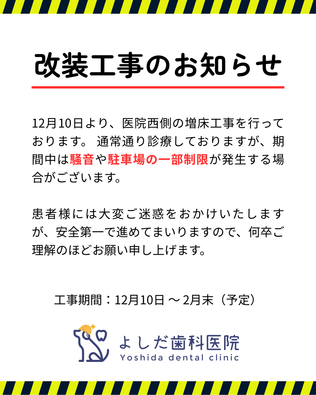 騒音・振動について 診療室とは壁で隔てられており、粉塵等の影響が出ないよう安全対策を徹底しておりますが、工事の内容によっては作業音や振動が発生する場合がございます。