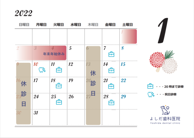 1月と2月の診療日のお知らせ 2022.01.09 1月と2月も祝日診療を行います。 祝日診療は全日朝9時~夕方6時半までの診療となります。 ご予約はお電話、またはWeb予約よりお願いいたします。 よしだ歯科医院
