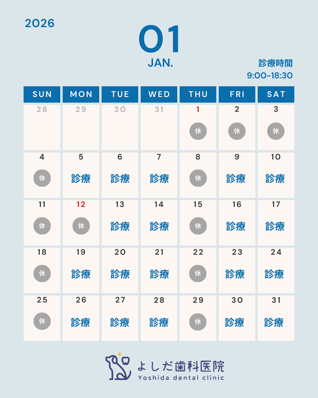 1月は以下のカレンダーの通り、診療いたします。