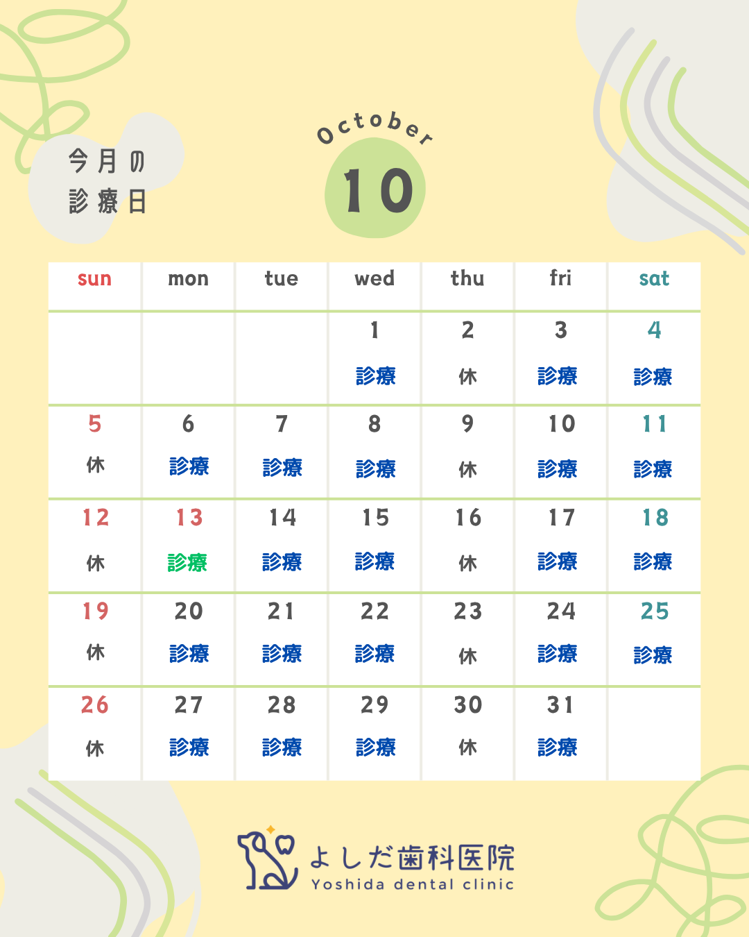 10月は以下のカレンダーの通り、診療いたします。
