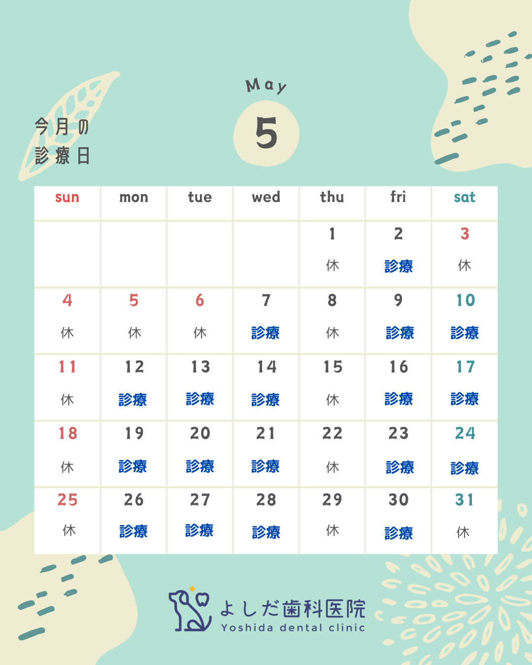5月は以下のカレンダーの通り、診療いたします。