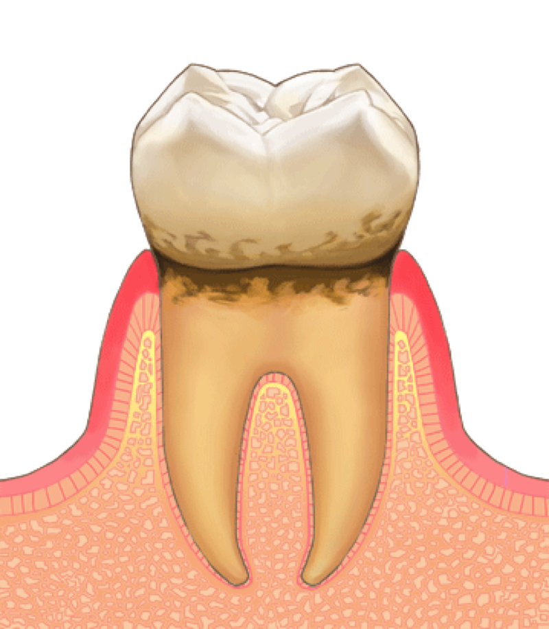 磨き残しなどがあると、お口の中の細菌はネバネバとした歯垢(プラーク)を形成します。歯周病は歯垢が歯茎や歯槽骨などの歯周組織に炎症を引き起こす疾患です。初期段階では、歯茎の腫れなどはありますが、痛みはほとんど生じません。しかし、放置していると、痛み、出血、口臭などのトラブルが発生します。このような状態になると、歯を支える骨の大部分が溶けていることも多く、最悪の場合は抜歯を検討せざるを得ません。歯周病は自然に治ることはありません。自覚症状も少ないことから、歯科医院における早めの早期発見・早期治療が重要になります。