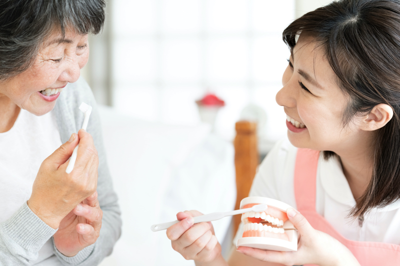 一人ひとりの患者様のお口の状況に合わせて、歯科衛生士が正しい歯磨きの方法をアドバイスすることです。染め出し液を用いて磨き残しのチェックを行ったり、歯ブラシの磨き方の癖をお伝えしたり、デンタルフロスなどケアグッズの使い方をレクチャーしたりします。